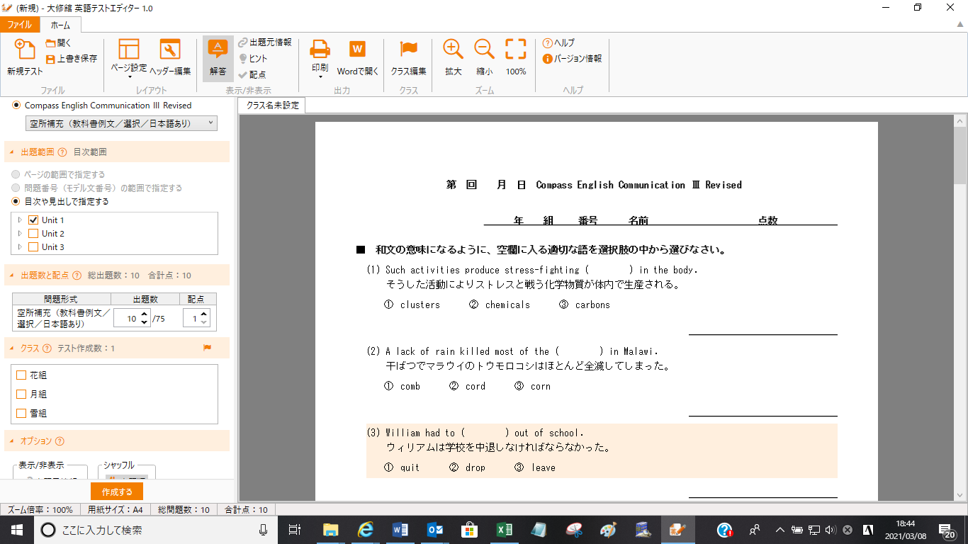 - 新出単語を使った小テストが作成できる自動問題作成ソフト。