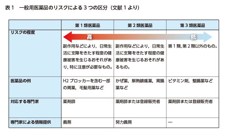 薬局やドラッグストアで販売されている市販薬(一般用医薬品)は、リスクの程度に応じて、第1類医薬品(特にリスクが高いもの)から第3類医薬品(リスクが比較的低いもの)までの3グループに分類されています(表1)。分類に応じて、販売できる専門家の職種(薬剤師あるいは登録販売者)や、販売時のルールが細かく決められています。