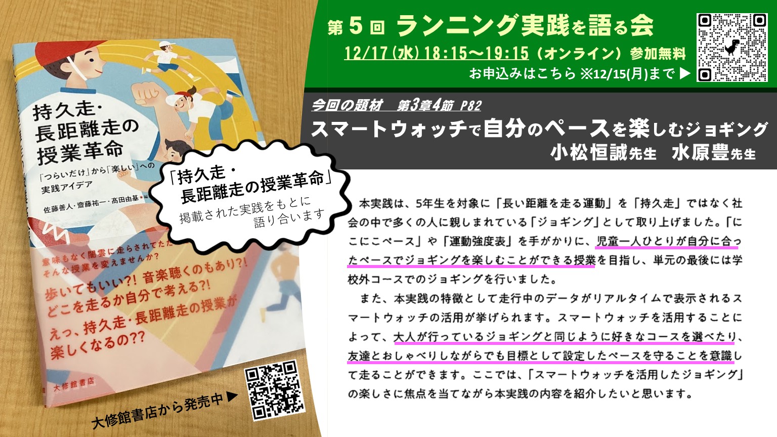 この度、その様子と参加者の学び(感想)を「保体編集部ONLINE」に掲載することとなりました。これにより、ますます拙書を活用して、持久走・長距離走の授業革命が進むことを期待しています。