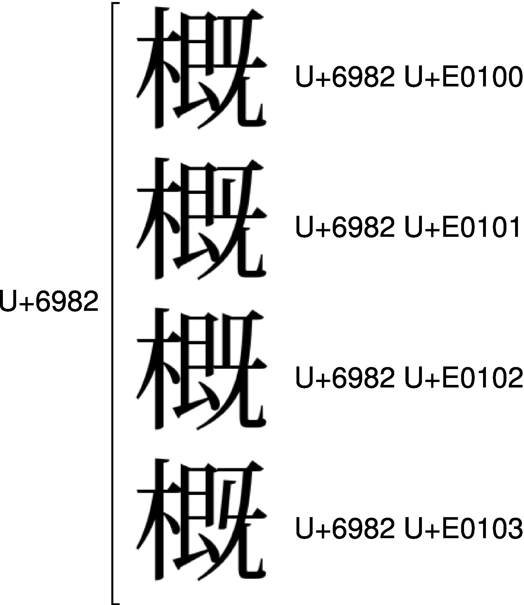 異体字セレクタは、U+E0100~U+E01EFの240種類が準備されています(コード表参照)。したがって、最大240種類の異体字が、IVSで表現できます。たとえばU+6982では、4種類のIVSが、それぞれ微妙に異なる字体を表しています。