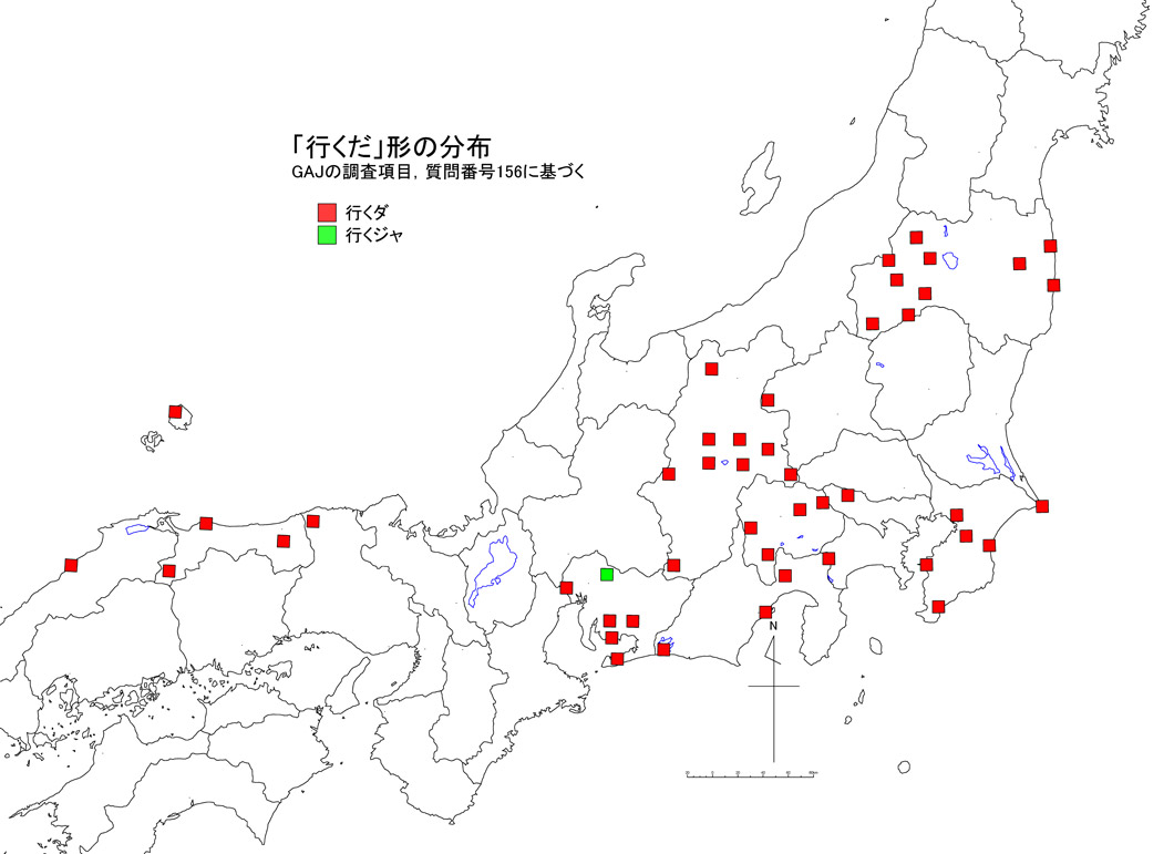 それでは、この「行くだ」のような言い方は、全国的に見渡すとどこで用いられるのでしょうか。それを示したのが、次の地図です(国立国語研究所編『方言文法全国地図』で地図化されなかった調査データに基づきます)。