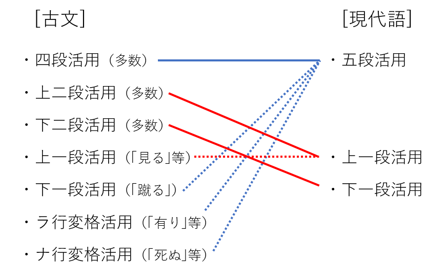 識別の方法を理解するために、まずは動詞の活用タイプにおける古文と現代語との関係を把握しましょう。次の図は、第2回で掲げた図の一部[6]をより詳しくしたものです。