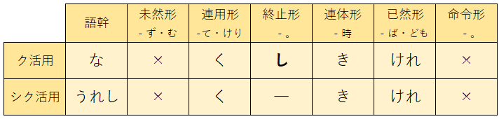 表② 古文のク活用形容詞「なし」とシク活用形容詞「うれし」の活用表 [2]
