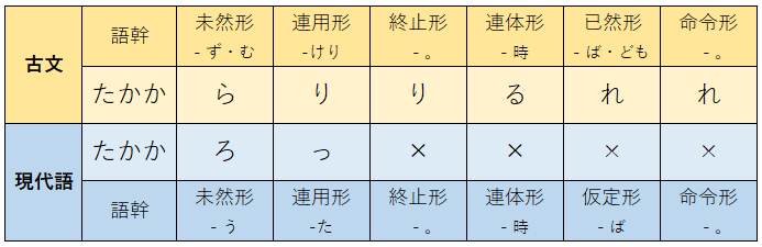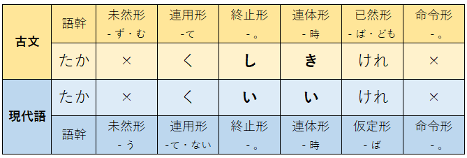 表① 古文の形容詞「たかし」と現代語の形容詞「たかい」の活用表 1(本活用)[1]