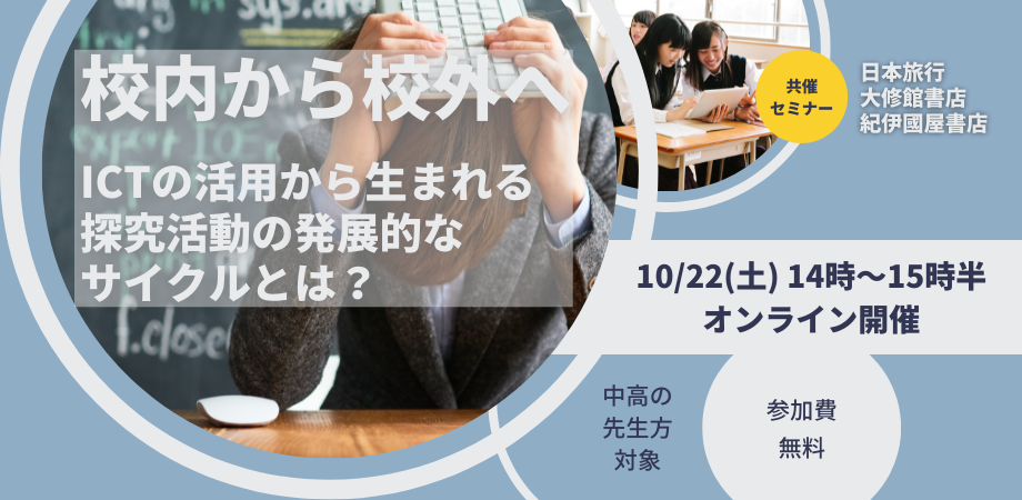 そこで今回、日本旅行・紀伊國屋書店と共催で,フィールドワークなどの校外での探究活動の事例と、そうした校外の活動をサポートする商品・サービスをご紹介するセミナー「校内から校外へ~ICTの活用から生まれる 探究活動の発展的な サイクルとは?~」を開催します。