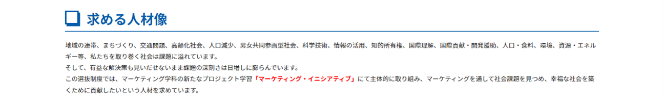 林氏 今年度から始める「MI(マーケティング・イニシアティブ)方式」(※)でも,社会課題を取り上げることにしています。高校生は探究学習で何らかの形で社会課題に触れたことはあるでしょうし,それに対して自分なりに問題意識を持ったはずです。課題自体は毎年本学から異なるものを出題していきますが,例えば少子化と言われた時に,少子化の中で何に問題意識を持って,何をテーマにするのかをこの方式では見ていきます。女性が結婚して出産しなくてはいけないことに対して,結婚は本当に必要なのか,あるいはもっと女性が働く環境をよくしない限りやはり結婚・出産は大変なのか,そういった「問いを立てる力」と「解決する力」を見ようというのが「MI方式」です。